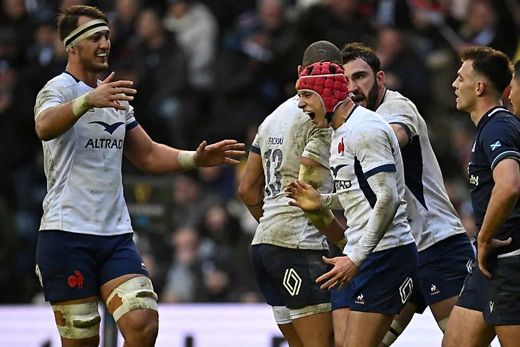 Следующий взрыв вновь от гостей – это Гаэль Фику убежал от всех с центра поля, но почему же пас не отдал вовремя? Дуан ван дер Мерве мяч перехватил. Скотты забрали чужой коридор (этот фокус потом удавался ещё не раз). После долгой атаки по центру они получили 100% штрафной – Расселл не промахивается. Вновь черёд французов владеть инициативой, но после затяжного розыгрыша последовала игра вперёд. А за 10 минут до конца тайма команды обменялись результативными уколами. Расселл забил с подставки, а Фику занёс попытку. Ле Блё наконец-то конвертировали своё давление в результат – продолжительная атака нападающими завершилась переводом Матьё Жалибера направо. Однако, в первом тайме это были ещё не все события.