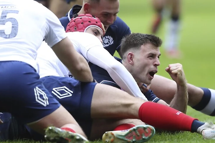 И занесли они уже на 6-й минуте! Красивую комбинацию, в которой поучаствовали молодой Харри Патерсон и Хью Джонс, завершил Бен Уайт. Очень типичная для нынешней сборной Шотландии атака. Финн Расселл конверсию забил. Ответный прессинг от французов не заставил себя ждать. В итоге наиграли на штрафной Тома Рамосу. 7:3 на 12-й минуте.