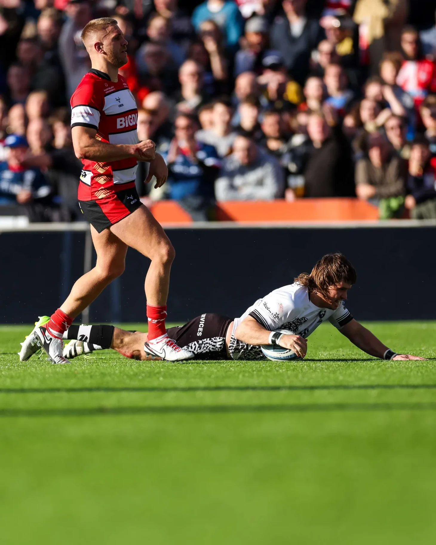 Через три минуты Габриэль Огре (2 номер) как заправский трехчетвертной заносит попытку по центру после паса от Макса Малинса. Уйдя финтами от защитников Глостера. МакГинти точен и разница в счете всего 7 очков.