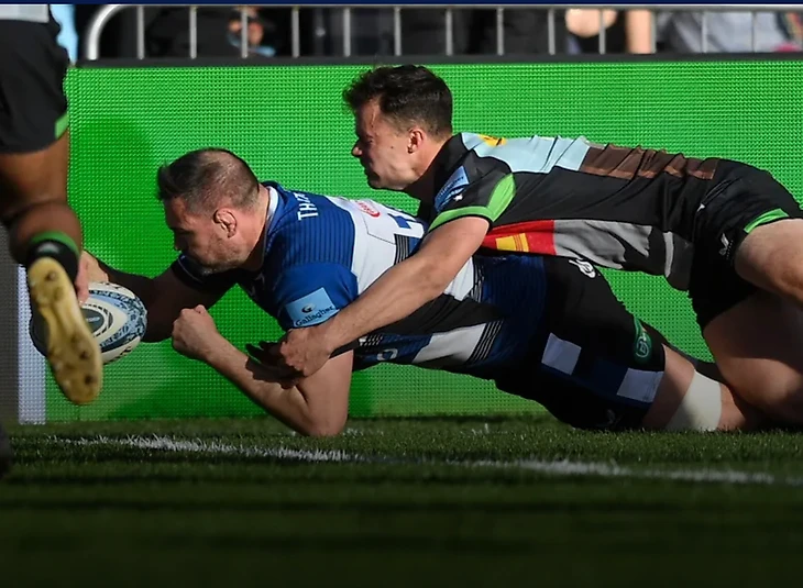 В ответной атаке Банщикам (прозвище Бат) удалось закрепиться в зоне 22-х метров Арлекинс и почти даже занести попытку. Ключевое здесь почти. Арлекинс хоть и с нарушениями правил останавливали регбистов Бата, но в одной из фаз атаки регбистов Бата остановили в десятке сантиметров от зачетки. Для того чтобы это увидеть, Вудторп посмотрел видеоповтор. На этом атака Бата не захлебнулась, а продолжилась. Правда далеко от зачетки. Маркус Смит нарушил правила в центре поля и Финн Расселл (10 номер) решил пробить по воротам, чтобы набрать 3 очка. Что в итоге и получилось.