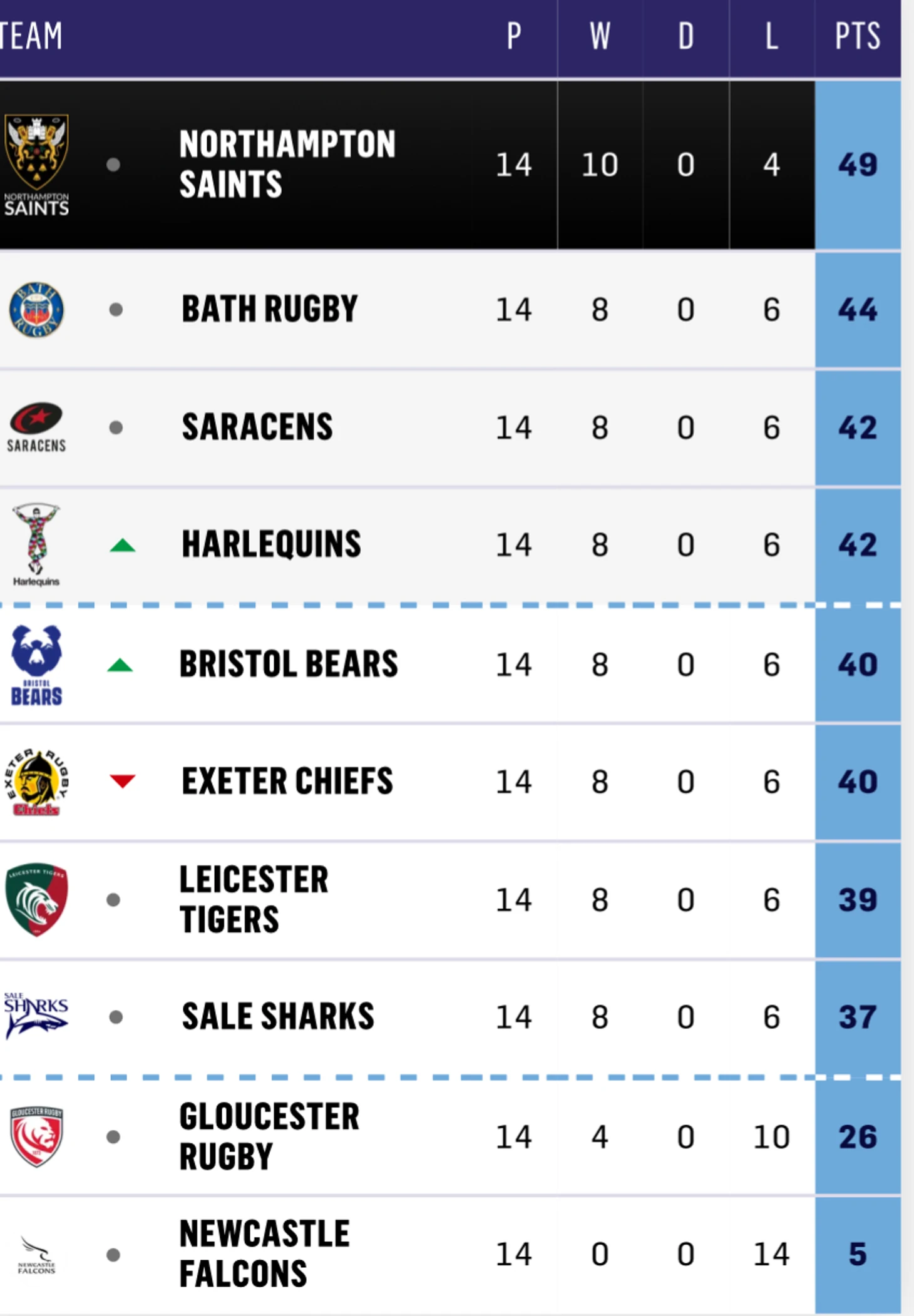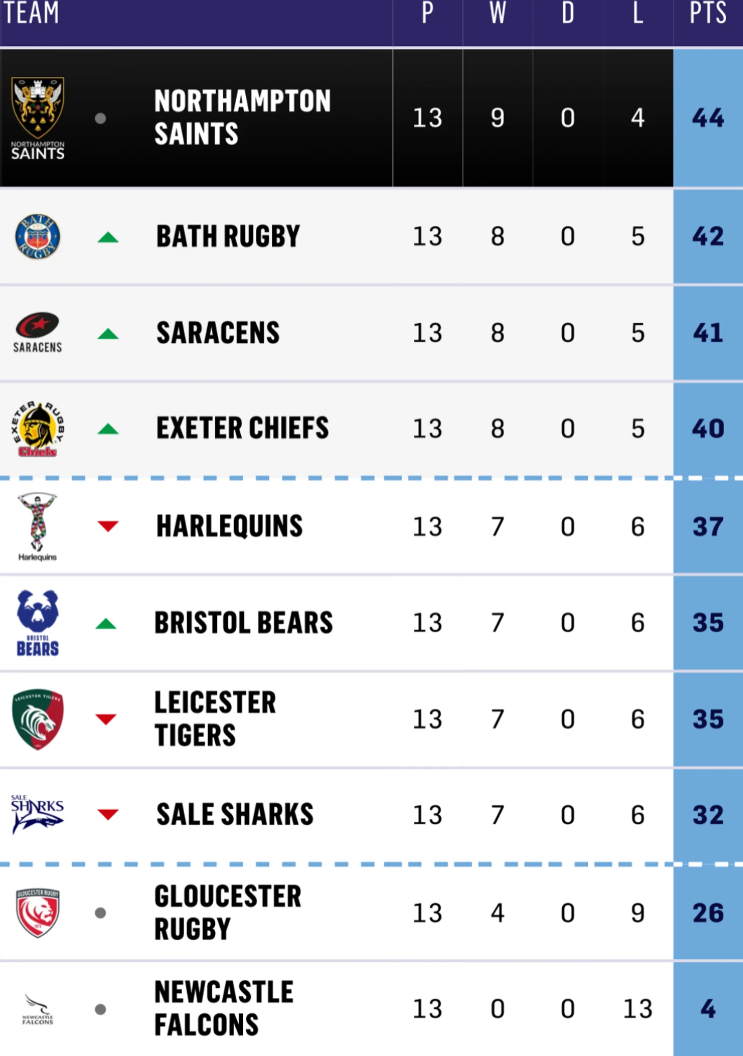 Нортхемптон Сайнтс после победы над Сарацинс остаются единоличными лидерами. Эксетер Чифс проиграли Сэйл Шаркс, которые занимают 8 место и опустились с 4-го места на 6-е место. Арлекинс и Бристоль Бирз победив в своих матчах обошли Эксетер. Но самое интересное в таблице заключается в том, что команды с 2-го места по 8-е выиграли по 8 матчей и по 6 проиграли. Только вот у второго места 44 очка, а у восьмого 37. Все это потому, что команды набрали разное количество бонусных очков. А бонусные очки даются за 4 и более попыток, а также за поражение с разницей менее 8 очков.