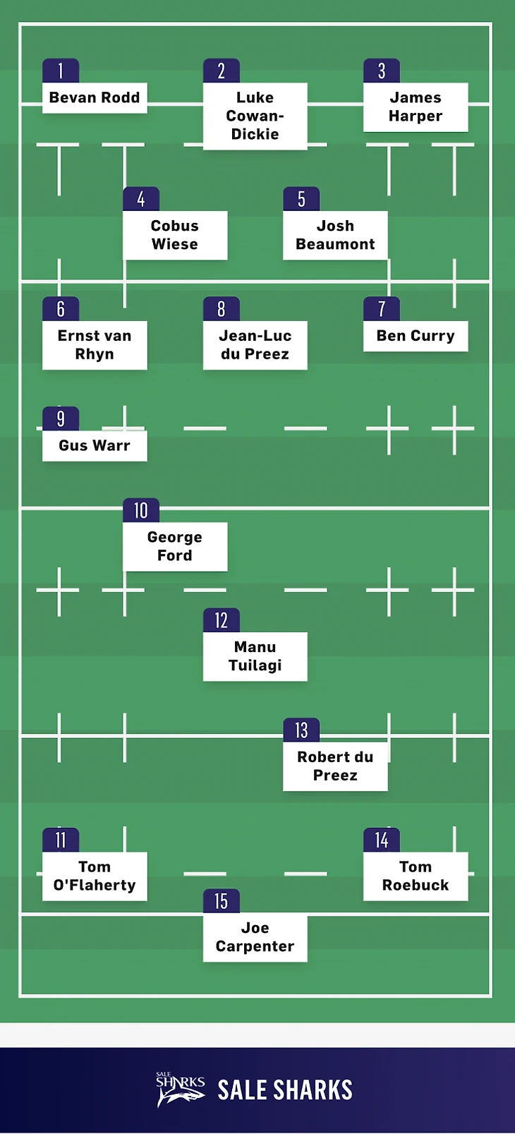 Спустя минуту первая замена случилась и у Сэйл Шаркс. Эрнст ван Рин (6 номер) неудачно действовал в раке и повредил колено. На его место вышел Сэм Дагдейл (23 номер). После этого Шаркс получили право на штрафной. Форд выбивает мяч в аут. Люк Коуэн-Дики (2 номер) вбрасывает аут. Мяч перемещается между игроками Сэйл Шаркс и Том Робак (14 номер) приземляет мяч в зачетку после того, как Джош Ходж (15 номер) не сумел захватить его. Форд забивает реализацию и счет становится 7-0.