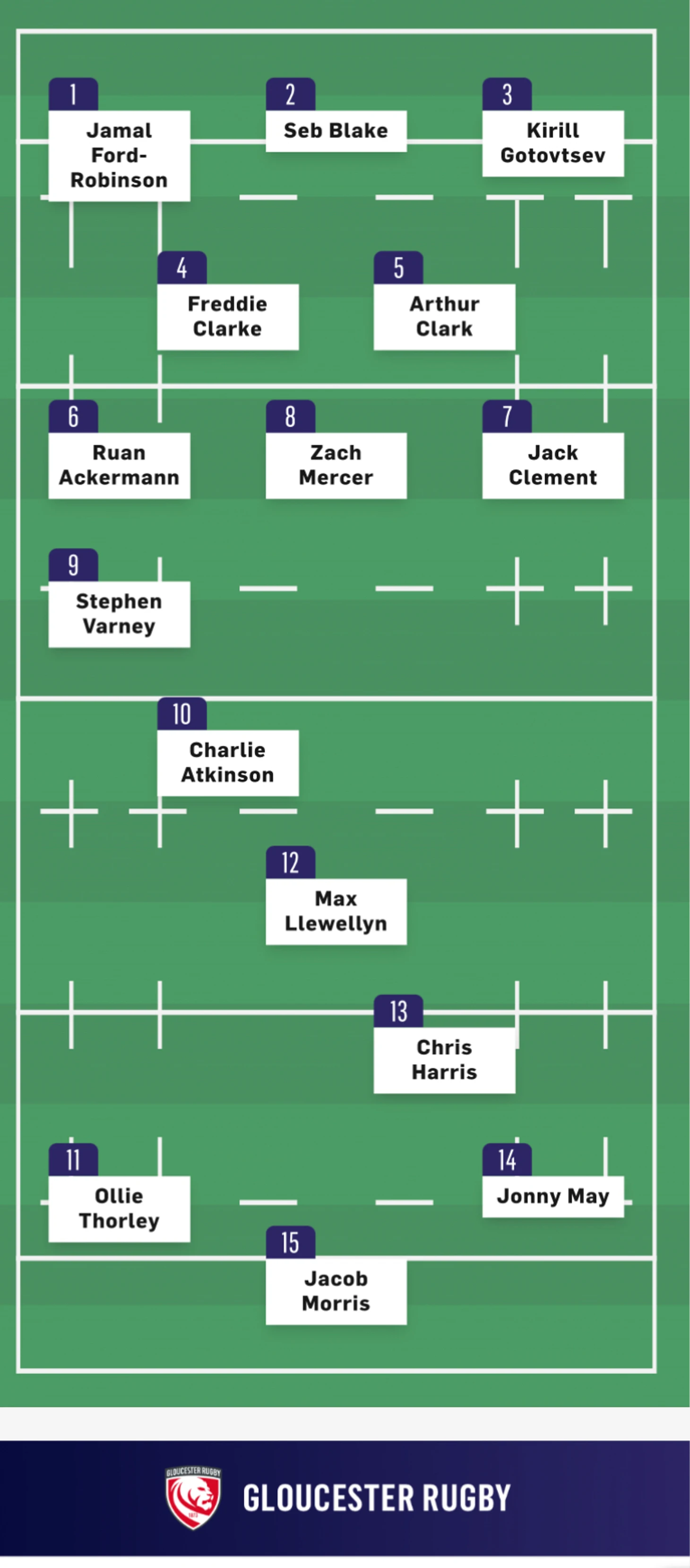 В этом матче после недельного отдыха вышел на поле в составе Глостера Кирилл Готовцев (3 номер). А стартовый удар по мячу нанес Харви Скиннер (10 номер) из Эксетера. А Стивен Варни (9 номер), поймав мяч, выбил егов аут.