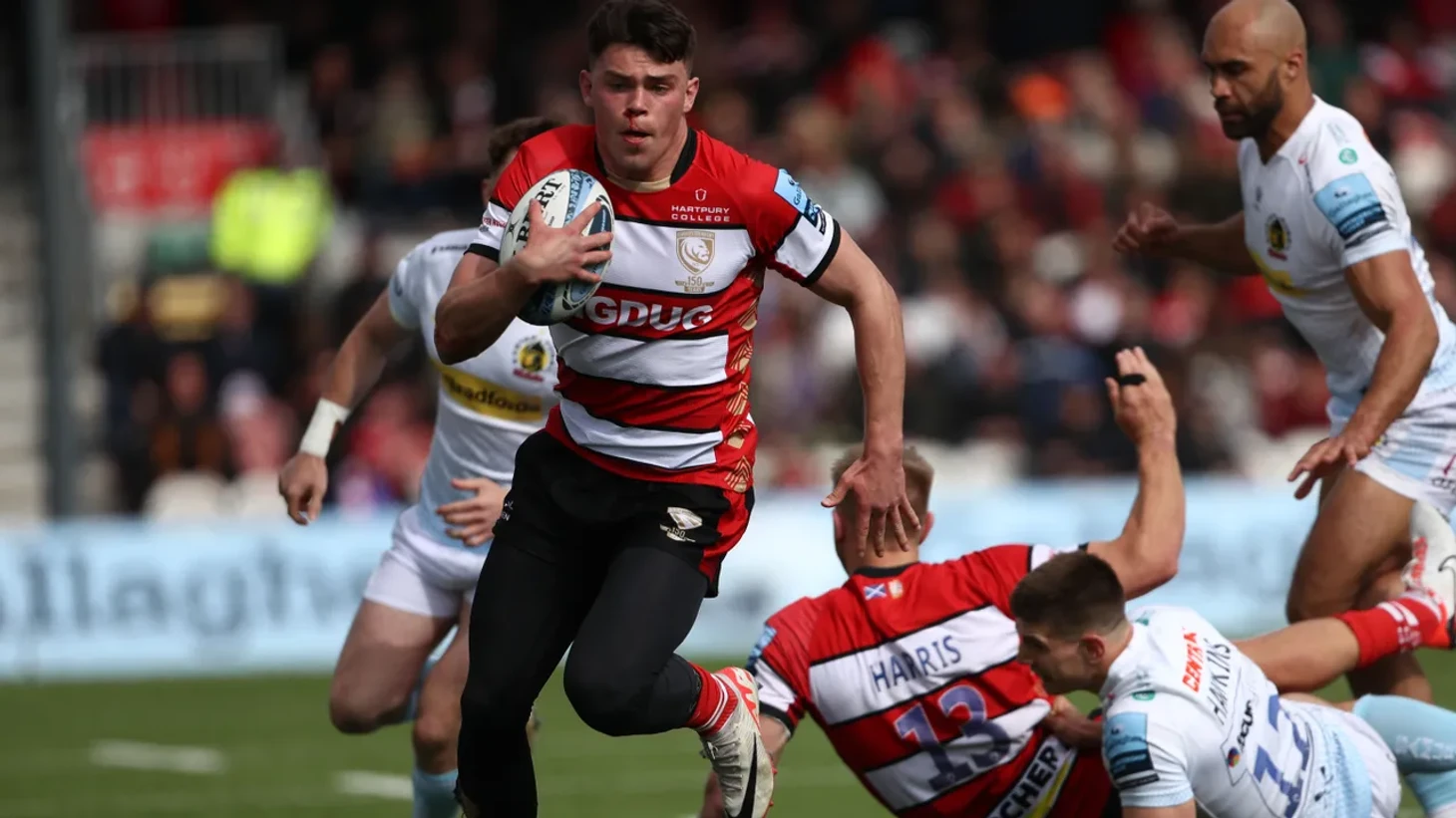 На пятой минуте матча Руан Аккерман (6 номер) нарушает правила при борьбе в раке и Кристоф Ридли даёт штрафной в пользу Эксетера. Хенри Слэйд (13 номер) решается на удар по воротам с 45 метров и открывает счет в матче. 0-3 не в пользу Глостера.