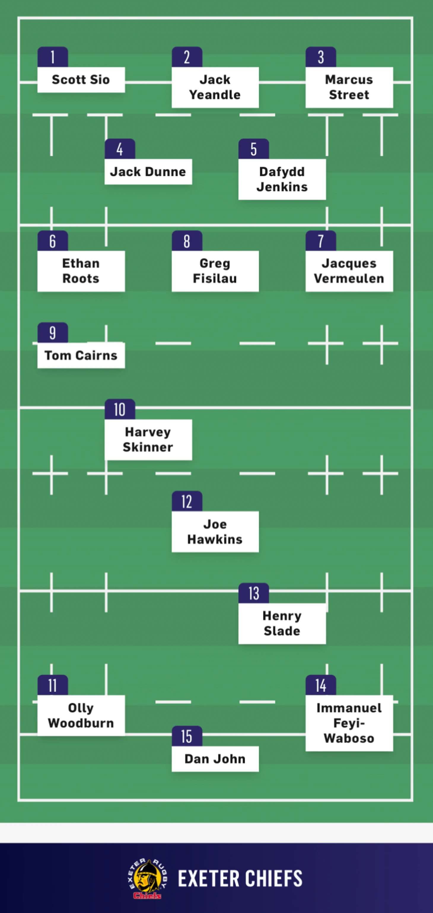 В ответ гости провели атаку на 21 фазу, которая была прервана нарушением правил Джеком Клементом (7 номер) в раке. Эксетер Чифс получили право на штрафной. Харви Скиннер (10 номер) выбил мяч в аут. При розыгрыше аута гости получили право еще на один штрафной. Быстро разыграв мяч, попытку занес Жак Вермуллен (7 номер), подавив Стивена Варни (9 номер). А Хенри Слэйд (13 номер) точно пробил реализацию с 35-ти метров.