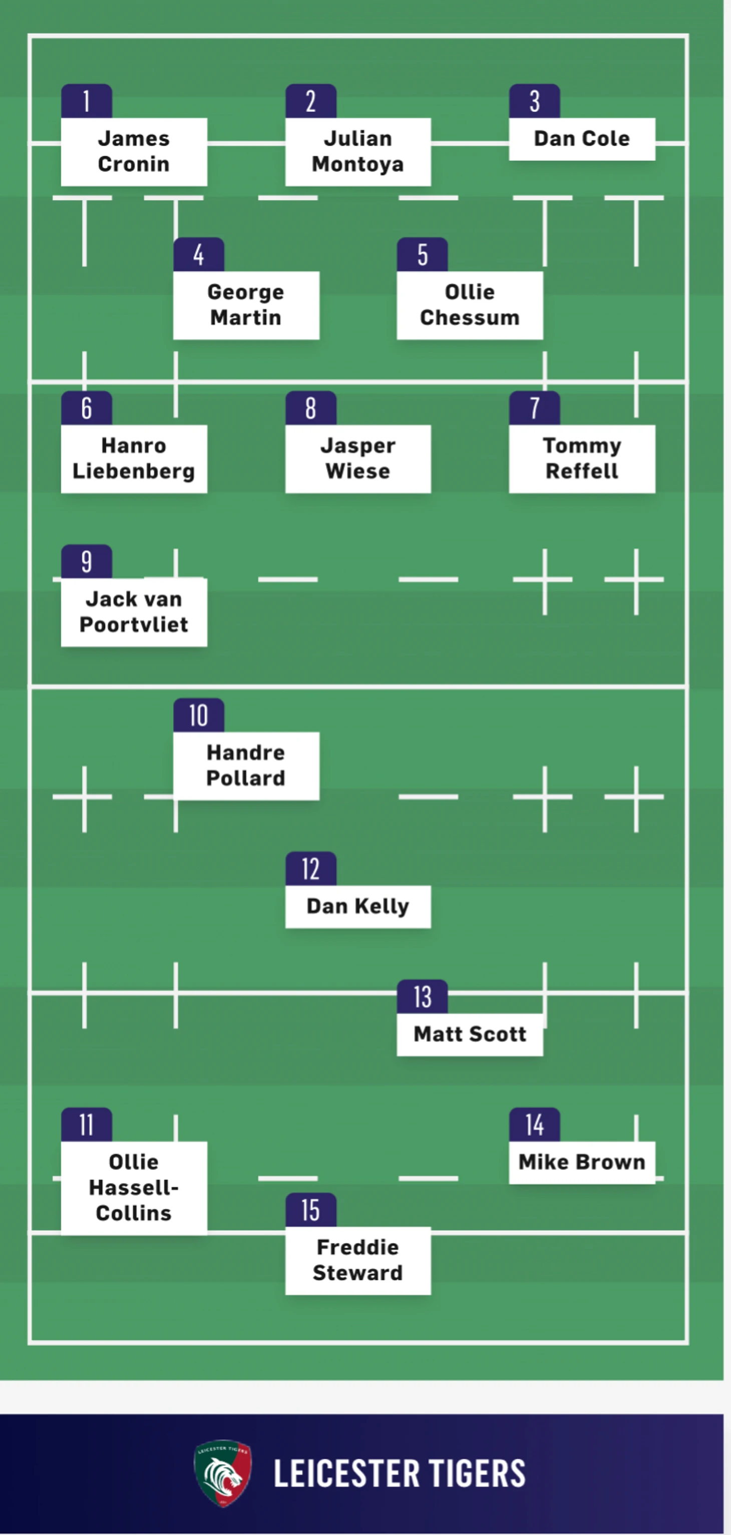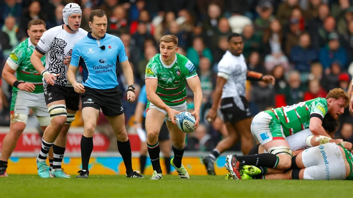 Нарушение правил в схватке регбистами Лестер Тайгерс в центре поля привело к тому, что Макс Лахифф (3 номер) был внесен с мячом в заметную зону хозяев. МакГинти (10 номер) забивает реализацию и счет 19-14 в пользу Лестера.