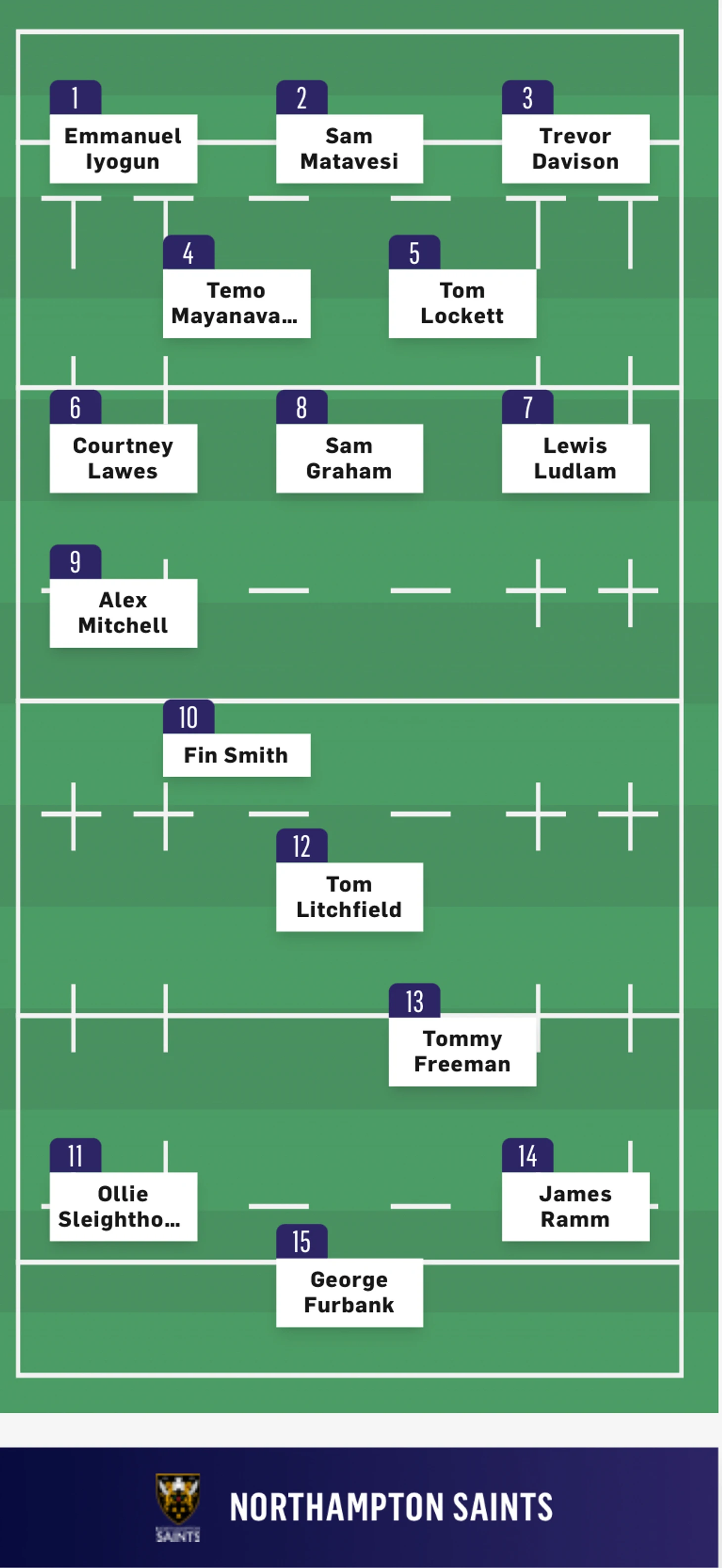 Стартовый удар с центра поля сделал Смит. Который Фин. Алекс Домбрандт (8 номер) поймал мяч и начал первую атаку в матче, которая завершилась тем, что Дэнни Кэр (9 номер) вернул мяч регбистам Нортхемптона.