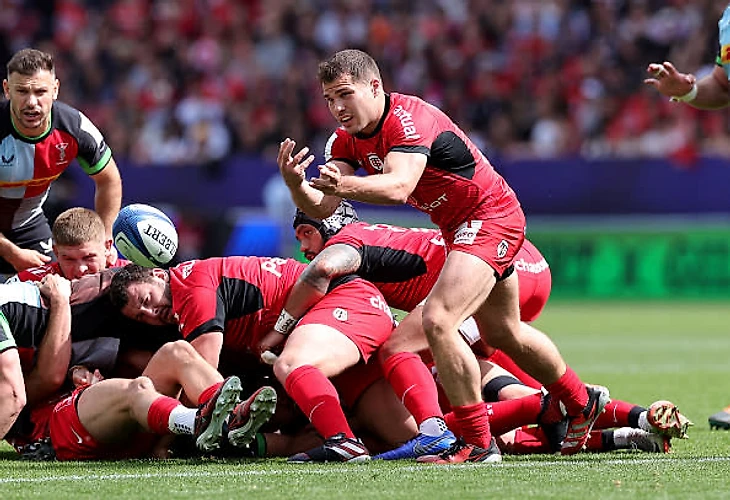 «Арлекины» в этом году уже сломали стереотипы о своей игре, дойдя аж до полуфинала, поэтому попытке в силовом стиле (больше похожим на своих соперников) удивляться не стоит. Маркус Смит завершил начатое партнёрами. И сам же забил реализацию. 5:7 – лондонцы лидируют. Игра раскрылась. В центре поля мяч отбирают то одни, то другие. На 18-й минуте «Тулуза» ставит мол, и заносит Пито Маувака. Кингхорн с подставки тоже не промахивается. «Арлекинс» идут отыгрываться. Луи Лайна бьёт 50-22. Лондонцы ставят мол, результатом которого становится попытка Уилла Эванса. Смити, жаль, промахивается с подставки. 12:12.