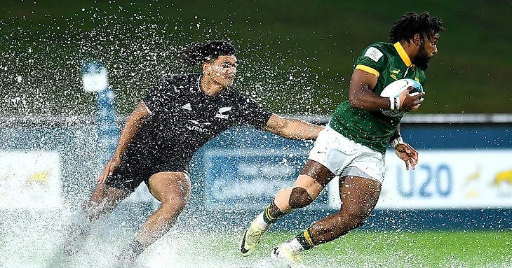 Матч-открытие первого молодежного Регби Чемпионшип был омрачен проливным дождем, превратившим поле в натуральное болото (не помогли и самоотверженные старания персонала разогнать лужи метлами и воздуходувками). По счастью, хотя бы к началу игру стихия немного утихла, хотя все равно было заметно, что обработка каждого паса требует концентрации внимания и аккуратности, атаки тормозят многочисленные лужи, а ощутимый ветер задувает все верховые мячи обратно на половину «Бокс». Отчасти, наверное, рисунок игры определял этот попутный «Олл Блэкс» ветер - они прочно завладели мячом и почти весь первый тайм атаковали южноафриканцев, хотя особенно близких к зачетке соперника подходов почти и не было.
