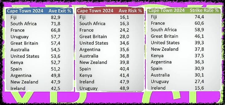 По средним значениям выхода, риска, эффективности владения лучшие показатели в Кейптауне у сборной Фиджи. Она неизменно на вершине всех трех таблиц. Но на средний рейтинг наибольшее влияние оказали две победы фиджийцев в играх против Уругвая в группе и Испании за 3е место. В них был достигнут максимальный результат в производительности атаки. 100% выход, нулевой риск и в обоих матчах страйк – каждое(!) владение Фиджи заканчивалось попыткой.