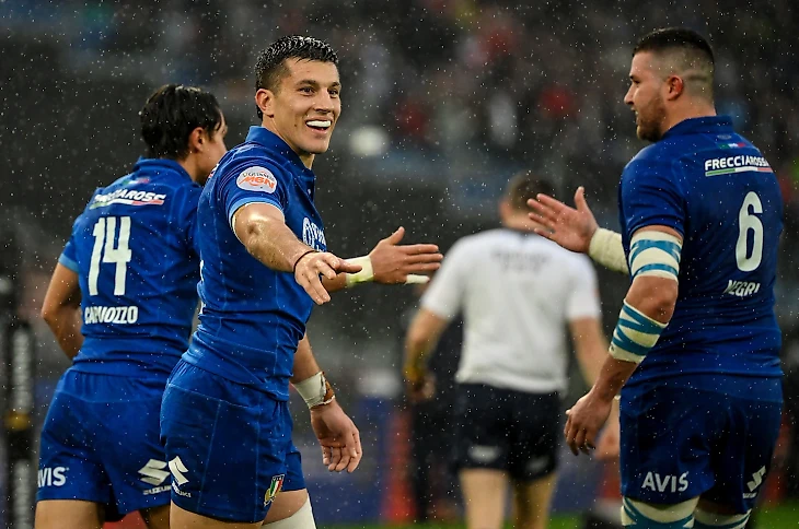На поле вернулись Паоло Гарбизи (10 номер) и Джош Адамс (11 номер). Эллиот Ди (16 номер) вбрасывает мяч из аута. Тэдди Уильямс (19 номер) ловит мяч, приземляется на землю и отдает мяч Аарону Уайнрайту (20 номер), которого партнеры по сборной внесли в зачетку итальянцев. А так как мяч оказался под Уайнрайтом, то Мэттью Карли засчитал попытку. Дэн Эдвардс (22 номер) пробил реализацию, а мяч попал в штангу ворот и отскочил в поле. 19-8 в пользу итальянцев.