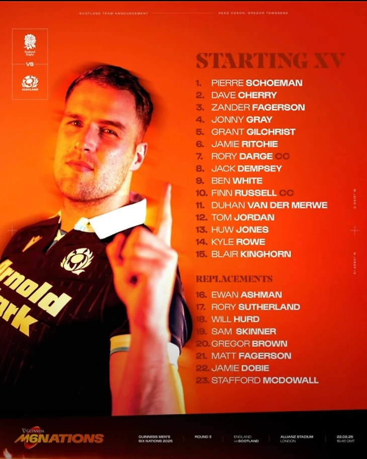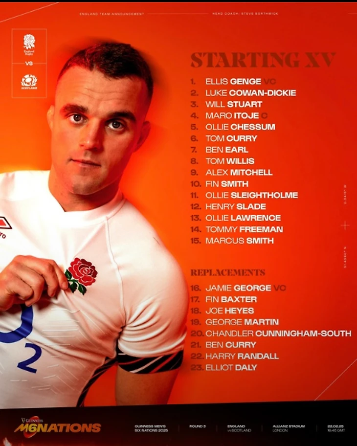 Очень интересно количество капитанов в этом матче. У шотландцев два капитана на поле, Финн Расселл (10 номер) и Рори Дардж (7 номер). А вот у англичан один капитан, Маро Итодже (4 номер), и два вице-капитана. Эллис Гендж (1 номер) и Джордж Мартин (16 номер). Будет интересно понаблюдать за тем, поможет ли англичанам такое количество капитанов в этой игре.