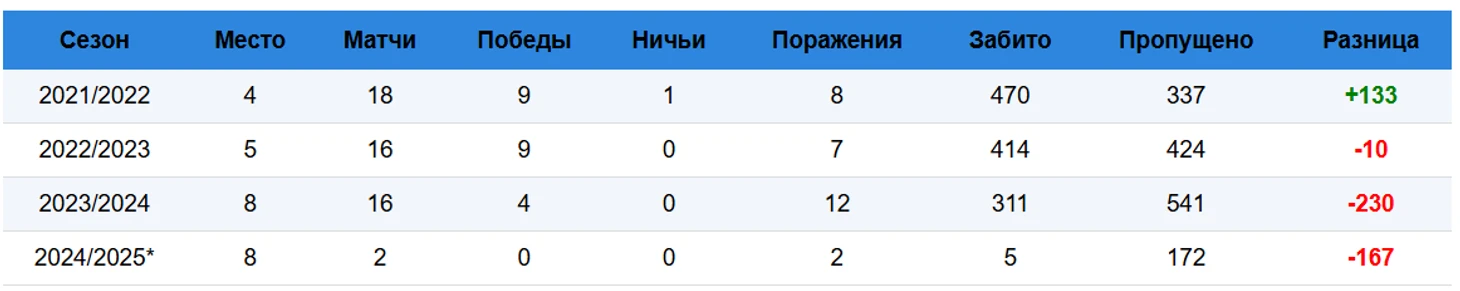 Новый сезон только начался, а настроение у болельщиков «ВВА» уже близко к отчаянию. Три матча — три тяжелых поражения: 5:86 от «Енисея-СТМ», 0:86 от «Красного Яра» и 10:66 от «Стрелы-Ак Барс». Разница очков — минус 223. Это почти повторение антирекорда прошлого сезона (-230), но достигнутого всего за три игры.