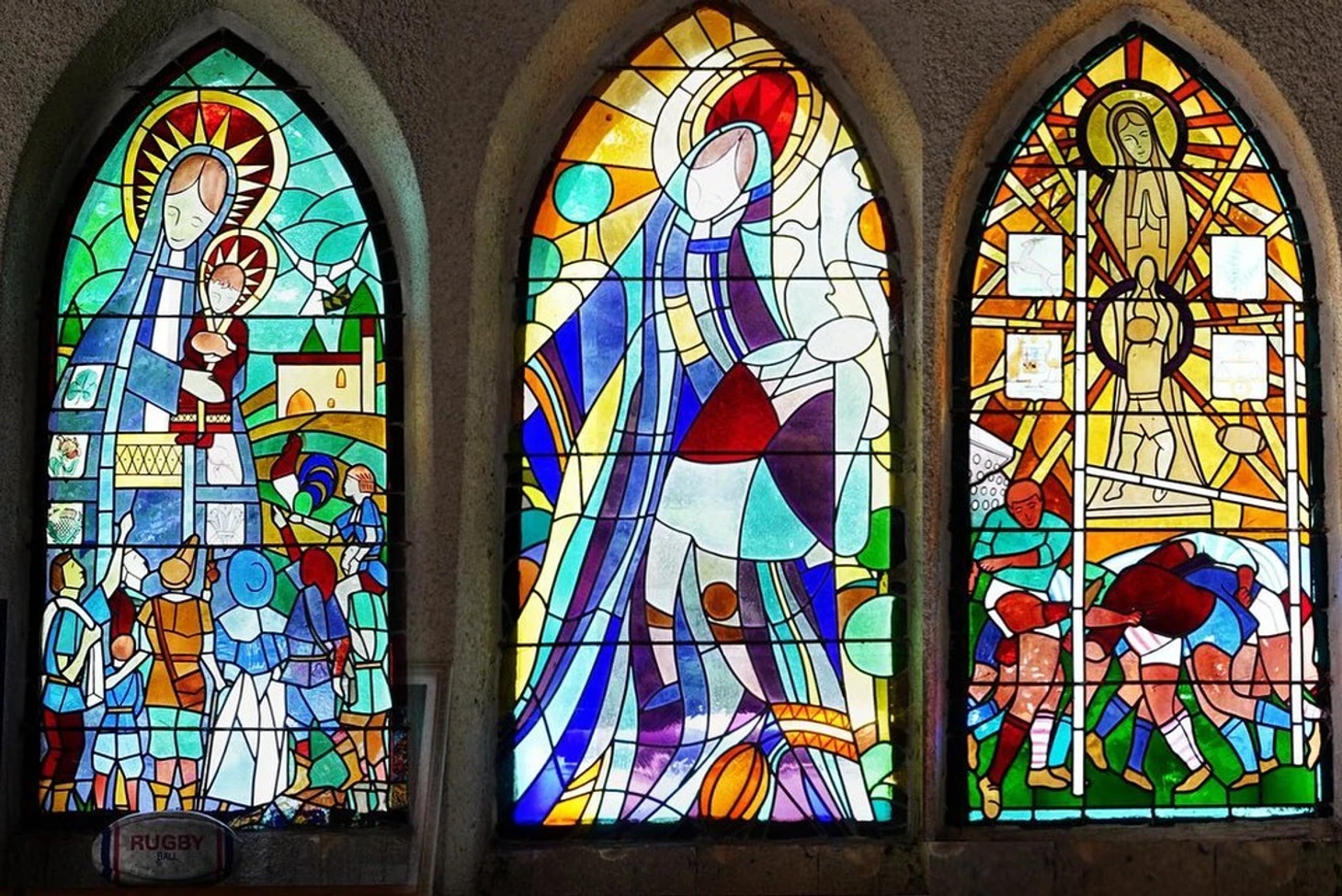 Переступив порог Notre-Dame-du-Rugby, посетитель попадает в необычный полумрак, озаренный цветными бликами. Солнечный свет струится сквозь витражи, где святые оказываются рядом с регбистами: Иисус изображен то в схватке, то бросающим мяч, а Дева Мария держит Младенца с регбийным овалом на коленях.
