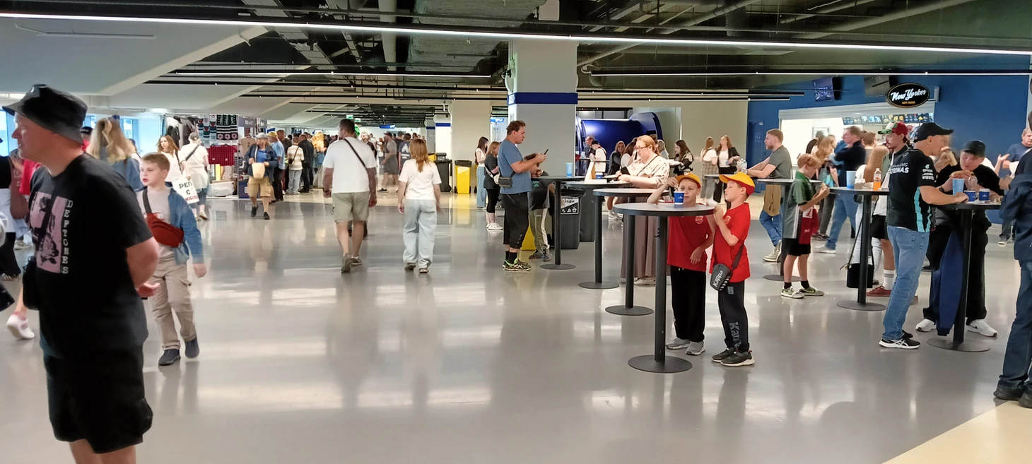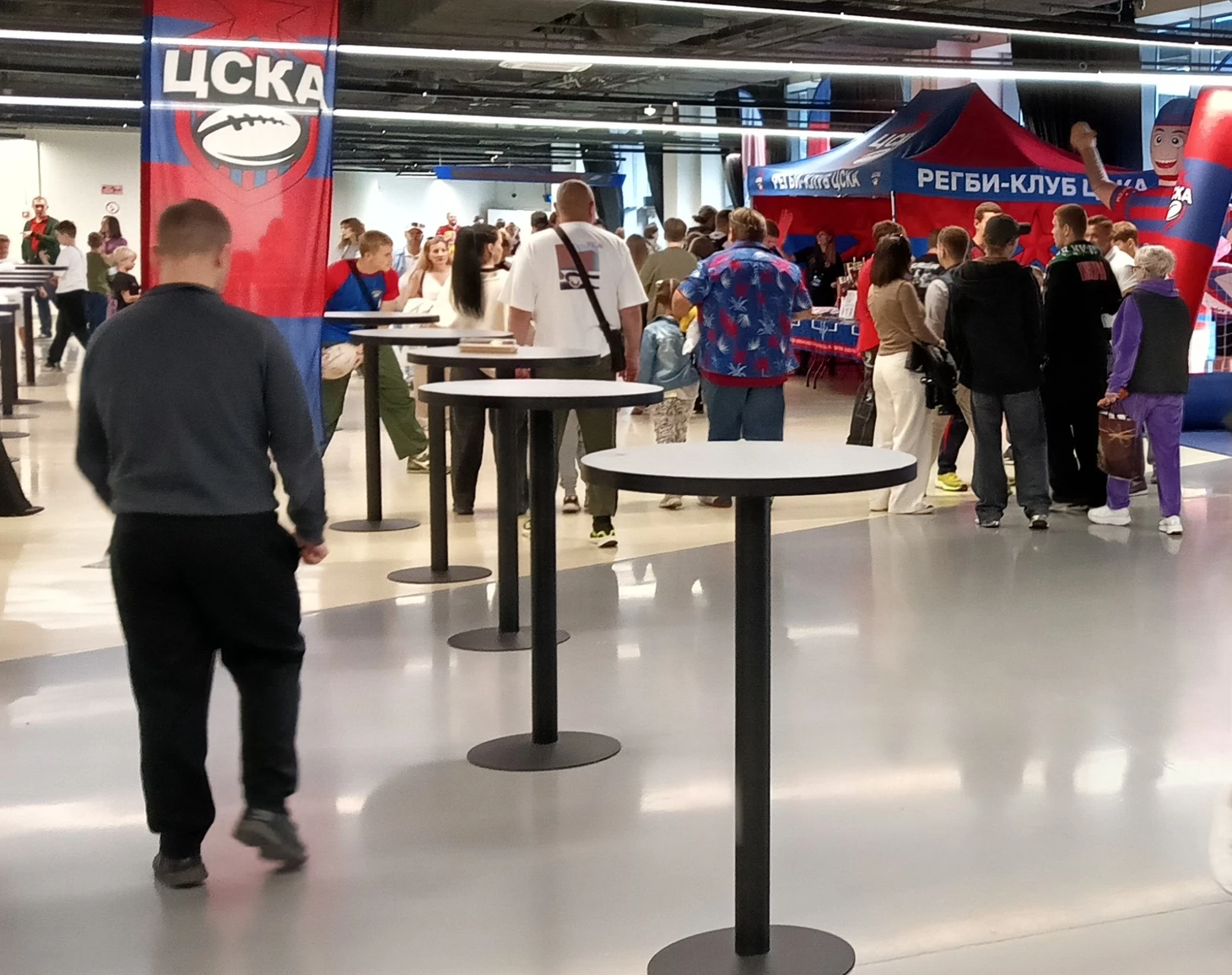 А во внутренних помещениях трибун стадиона посетителей ждали аквагрим, маскоты не только играющих в финале кубка команд, но и столичных регбийных клубов Фили и ЦСКА, напольный мини-керлинг, надувной аттракцион с конкурсом «точный бросок мяча», разумеется буфет с пивом (безалкогольным), и много других развлечений. Народ кучковался возле палаток Регби-Маркета, цены – шарф 1500, кепка 2000, мяч 5500₽.