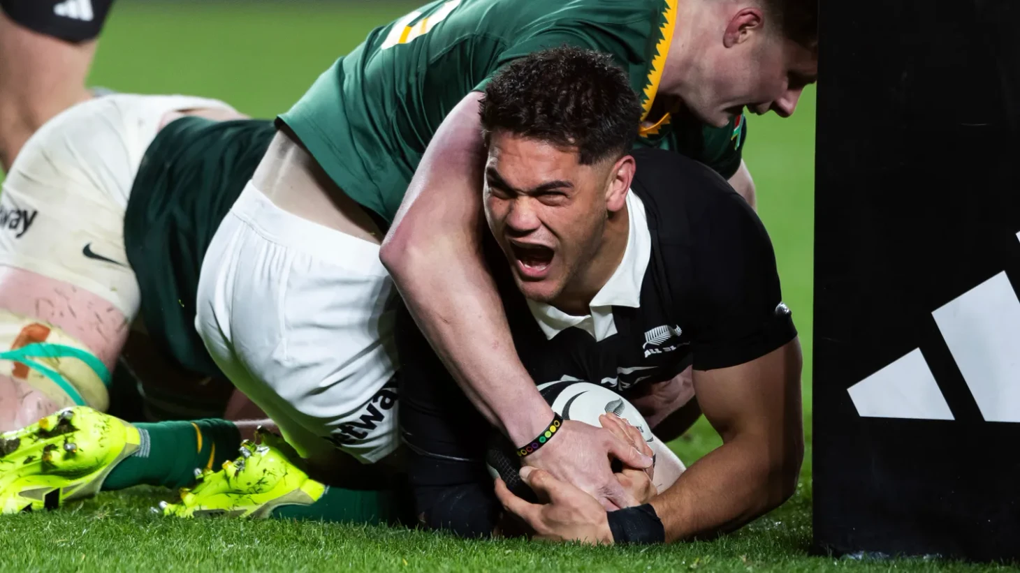 Порыв шквального ветра словно задал тон грядущей бурной битве. Но уже спустя минуту после стартового свистка «Олл Блэкс» реализовали комбинацию прямо из предматчевого плейбука. Молниеносно разыгранный вбрасывание с аута — и мяч у Бодена Барретта, который точнейшим кроссом нашел Эмони Нараву на правом краю. Оборонительная линия «Спрингбокс» была скучена в центре поля, и Вилли ле Ру остался последним защитником. Нарава поймал мяч на уровне колен, проскользнул между ног фулбэка, поднялся на ноги, сделал ложный замах на передачу внутрь и занес великолепную попытку, которую затем реализовал Джорди Барретт.