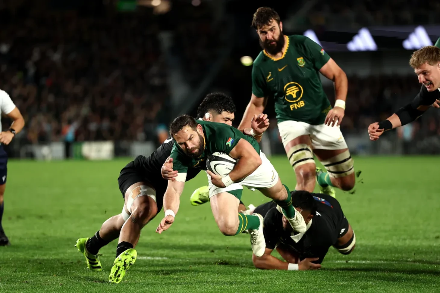 Новозеландцы с самого начала показали — они досконально разобрали оборону “Спрингбокс” и знали, куда бить. Уже на шестой минуте Нарава был вынужден покинуть поле с травмой ребра, и его заменил Дэмиан МакКензи. Хозяева продолжили давить: за небрежный удар ногой со стороны «Спрингбокс» они тут же наказали — Барретт отправил мощный удар вглубь поля, 50:22.