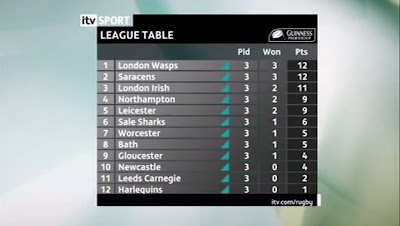 чемпионате. Лондон Уосп - 2 домашных -1 гостевой Сарасенс - 2-1 Лондон Айриш 1-2 Нортхэмптон 1-2 Лестер 1-2 Сэйл 2-1 Вустер 1-2 Бат 1-2 Глостер 2-1 Ньюкасл 1-2 ( при 2х ничьих) Лидс 2-1 Халекуинс 2-1 Тур 4 в Англии начинается с 25 сентября.