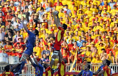 . Красивая игра, 5 попыток, потрясающий суппорт на трибунах. Успех пришел к Перпиньяну без двух супер-игроков, новозеландец Дэн Картер травмирован, а шотландец Натан Хайнс отправлен в составе Львов в турне по Южной Африке. Форма клуба Перпиньян желто-красная в цветах каталонского флага,а каталонский флаг -один из самых старых в мире. Легенда гласит, что этот золотой фон с четырьмя красными полосами был создан тогда, когда в IX веке император Луи Ле Пие провел окровавленными на войне пальцами по щиту, принадлежавшему графу Барселоны Вилфреду Волосатому.