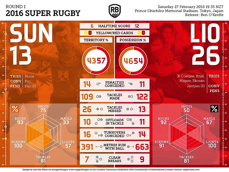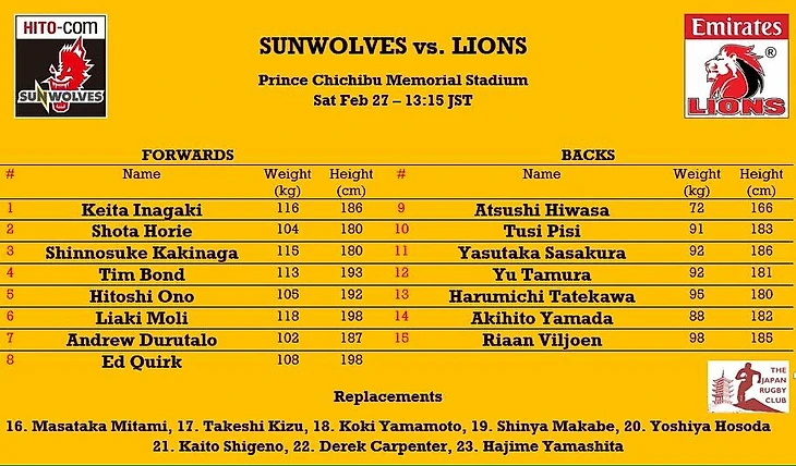Дебют Sunwolves состоялся в «доме японского регби» – Prince Chichibu Memorial Rugby Ground, при аншлаге на трибунах. Первые очки в Super Rugby в историю клуба вписал Туси Писи, забив штрафной. Lions отыгрались мощно – двумя попытками, на которые у японцев в ответ нашелся лишь штрафной, в исполнении все того же Писи. На перерыв команды ушли при счете 6-12. А во втором тайме Sunwolves дожали соперника у зачетки и, усилиями капитана Хори, занесли первую попытку команды в Super Rugby. Правда, опять пропустили два прохода соперника, но провальным дебют назвать все-таки нельзя. Первый урок получен, по результатам будет сделан разбор, и можно двигаться к новым испытаниям.