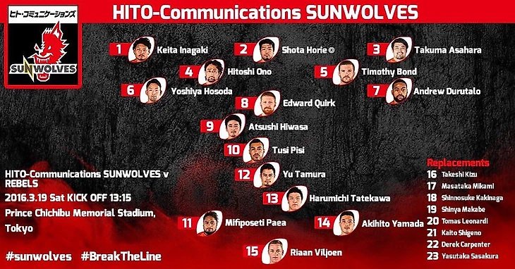 В четвертом раунде, после двух матчей с южноафриканскими командами, Sunwolves впервые пересеклись с клубом из Австралии. Rebels прибыли в Японию в минувшую среду. В Токио «повстанцам» предстояло сыграть против команды, ведомой хорошо знакомым им хукером – Шота Хори. Нынешний капитан Sunwolves в 2013 году стал первым японцем, заигранным в Super Rugby за австралийский клуб. Всего Хори сыграл 18 матчей за Rebels. В 2014 даже получил внутриклубную награду ‘People’s Choice’, став любимцем австралийских болельщиков. Также за «повстанцев» в 2014 году 8 матчей отыграл Мале Сау (Male Sa'u ), который теперь выступает за новозеландский клуб Blues. В 2015 году в составе «повстанцев» играл Кейта Инагаки (Keita Inagaki), правда, всего один матч. А в нынешнем розыгрыше Super Rugby за этот австралийский клуб заявлен еще один японец – Котаро Матсушима (Kotaro Matsushima). Вот такие тесные отношения с Японией у Rebels.