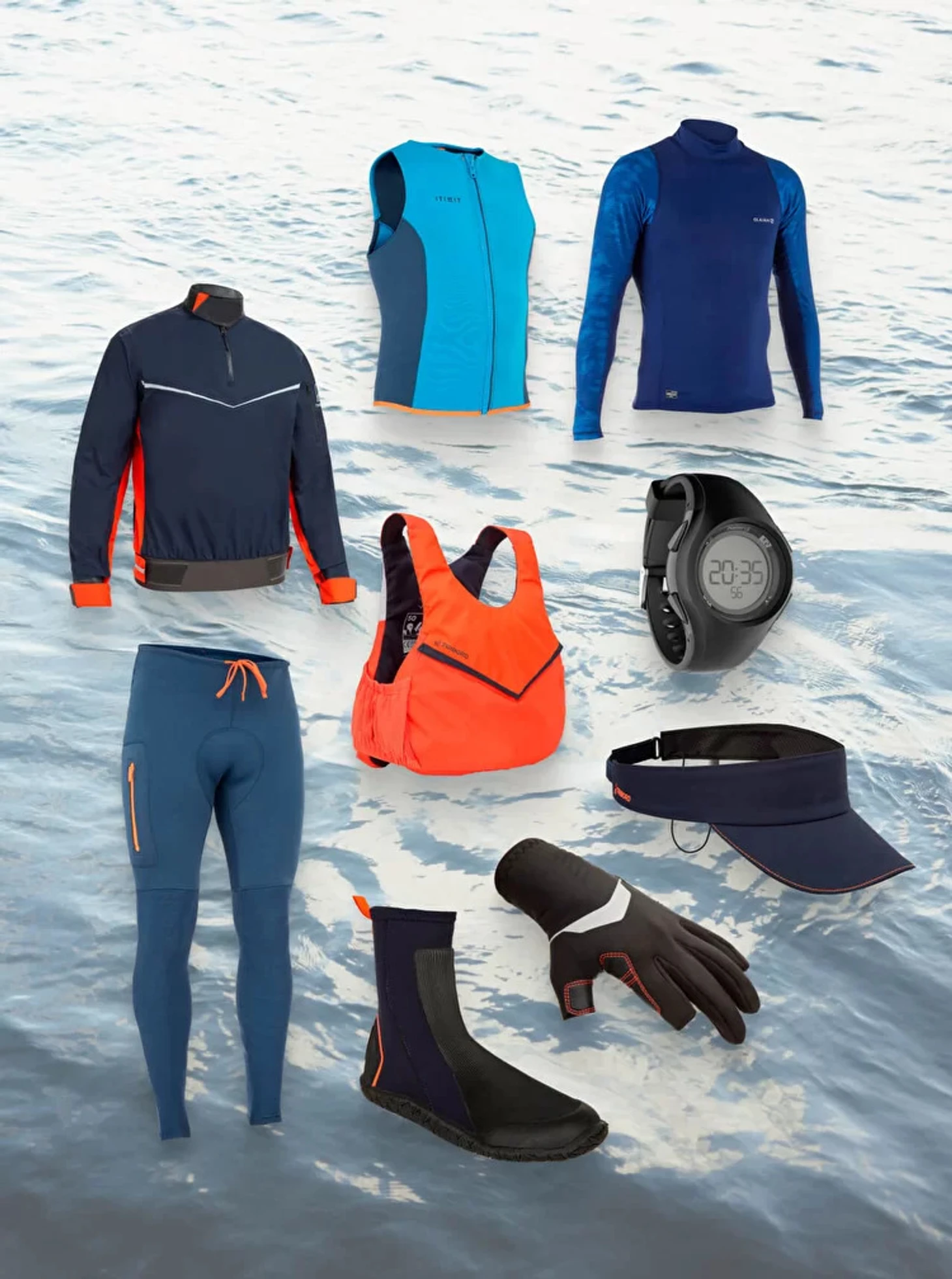 Вот набор вещей, который поможет сосредоточиться на управлении лодкой. Поверх всей одежды у вас всегда будет спасжилет — это правила безопасности.