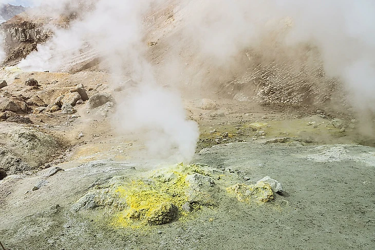 Фумарола — Дымящийся остаток обычно потухшего вулкана, которых на Курилах огромное множество. Обычно характерен обильными серными извержениями и красивым дымом.