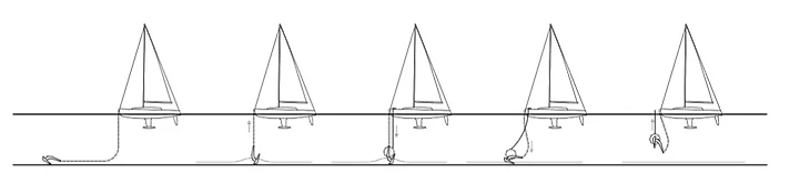 1) Подводим яхту к месту, где лежит якорь, выбирая слабину якорной цепи. Когда яхта оказывается над якорем, цепь идет вертикально вниз.