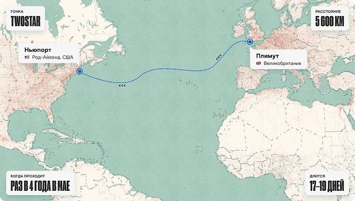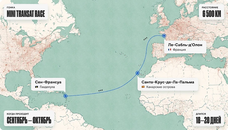 Созданная в 1977 году гонка, призванная воссоздать первые трансатлантические путешествия, проводится для яхт с одним человеком каждые два года. Естественно, это нешуточное и непростое испытание, а потому соревнование так ценится в комьюнити — в рамках подготовки к нему нужно пройти массу квалификационных испытаний в виде офшорных гонок. С недавних пор в Mini Transat Race участвует множество отечественных спортсменов — в последнем цикле спортсменка Ирина Грачева (у которой мы брали интервью в прошлом году) финишировала четвертой с результатом 15 дней 5 часов и 41 минута.
