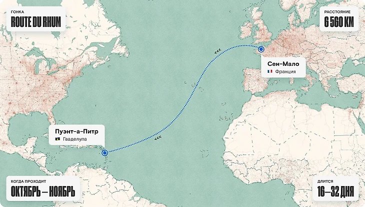 Офшорная гонка для нескольких классов (отсюда и такой разброс в продолжительности), которую с 1978 года раз в четыре года устраивает французская Федерация парусного спорта, в кругу гонщиков известна также как «Трансатлантическая свобода» из-за достаточно вольных правил участия. В середине 2010-х эта гонка была одним из самых популярных спортивных мероприятий во Франции, уступая лишь «Тур-де-Франс», футбольной Лиге 1 и теннисному турниру «Ролан Гаррос», так что для страны Route du Rhum — одно из важнейших национальных достояний. Рекорд по прохождению дистанции установили в прошлом цикле, в 2018 году: Франсис Жуаон уложился чуть больше чем за неделю.