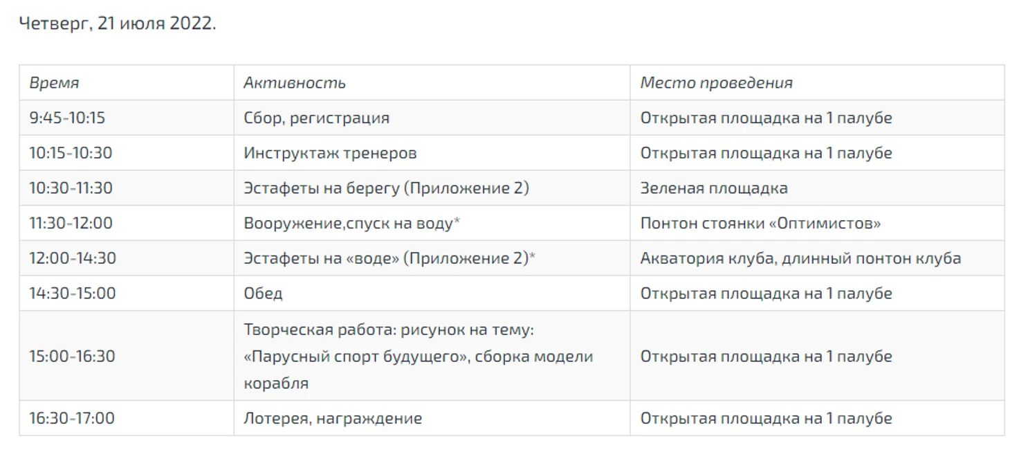 Тренерский штаб парусной академии Tenzor Sailing Academy подготовил для участников насыщенную программу на 21 июля 2022 года.