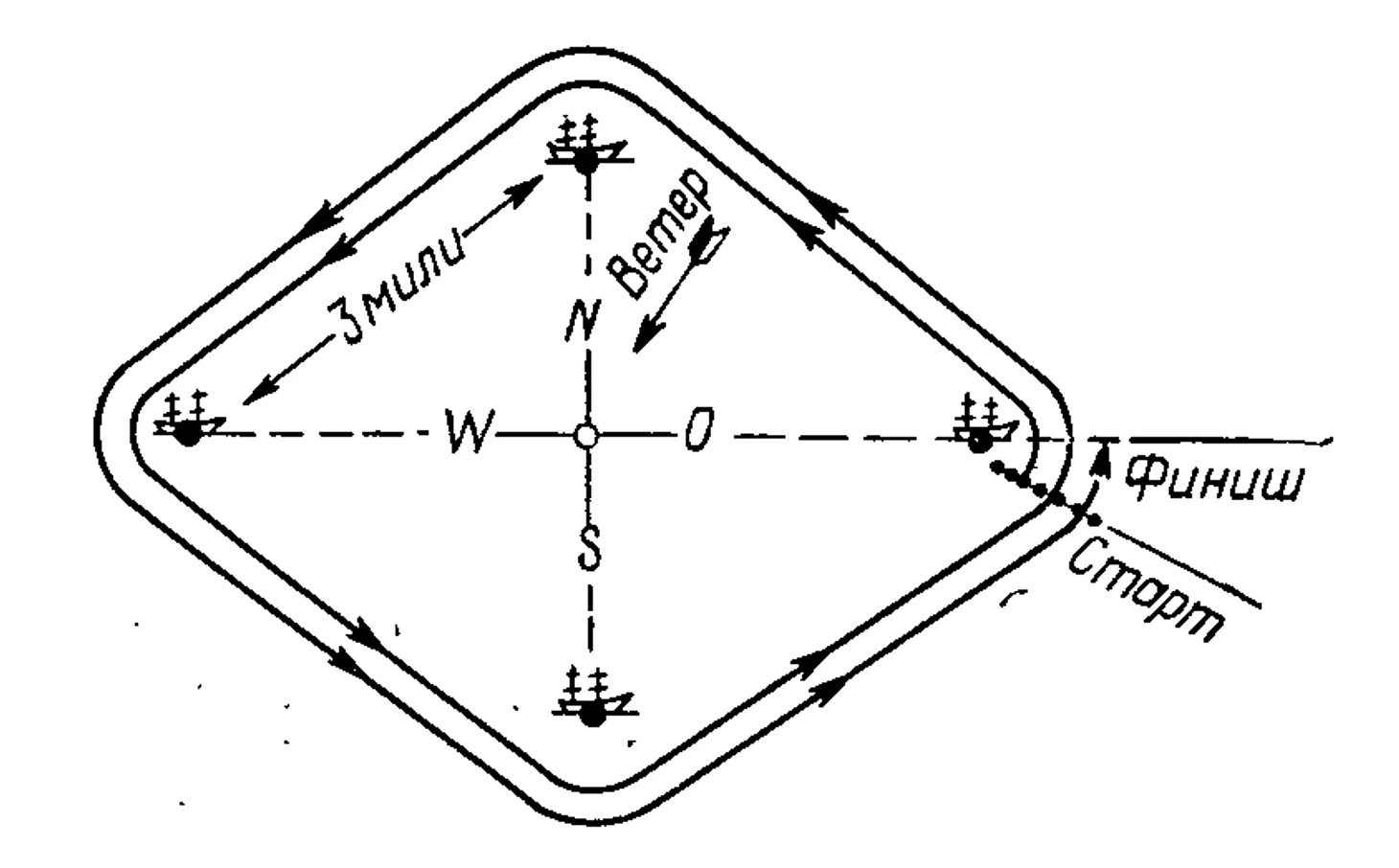 Дистанция имела непривычный для современных гонщиков вид: она образовывала ромб со стороной в 3 мили (1 морская миля = 1852,4 м), вершины которого располагались в направлении четырех главных румбов (т. е. на север, восток, юг и запад). В каждой из вершин был поставлен на якорь корабль: три из них служили поворотными знаками, которые яхтам следовало последовательно обогнуть при движении по дистанции; четвертый же (восточный), бриг «Казарский», помимо этого являлся судейским или, как тогда говорили, «адмиральским» судном: на нем находился главный судья гонок контр-адмирал Шанц. На стартовой линии, перпендикулярной направлению ветра, расставили семь бочек, на которые и встали по жребию яхты.
