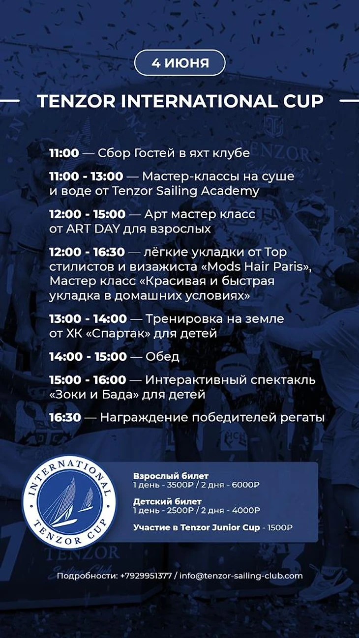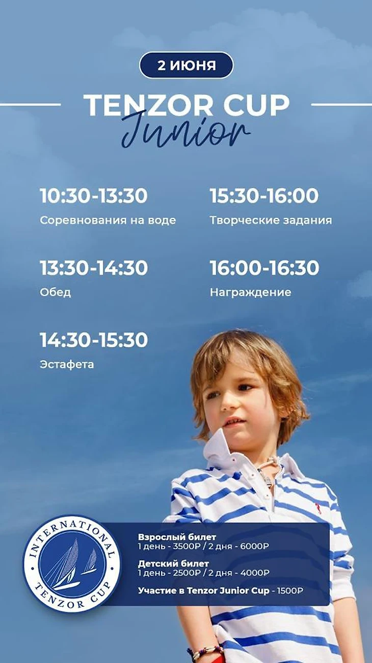 Откроют фестиваль 2 июня детские спортивные соревнования Tenzor Cup Junior. Юные участники смогут показать свои навыки хождения под парусом на швертботах «Winner Optimist» и сапбордах, соревнуясь в эстафетах на воде, проходя испытания на силу и ловкость, интеллект и смекалку на береговых эстафетах и проявить творческие таланты на конкурсах.Чудесные подарки от партнеров проекта – сети салонов «Кенгуру» и компании Smartbar приготовлены для всех детей.