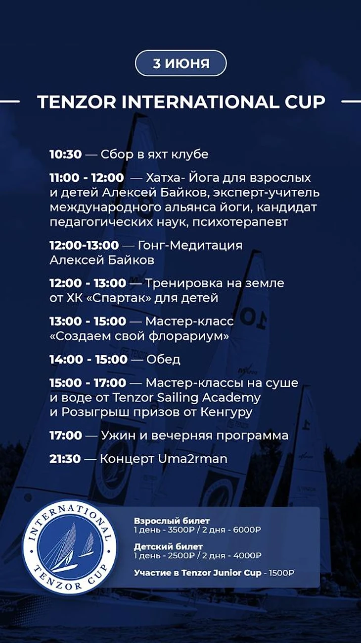 Уже в эти выходные пройдет 1 этап Tenzor International Cup. Пока спортсмены ведут зрелищную борьбу на воде, на берегу пройдет большой яхтенный фестиваль TIC SAILING FEST 2023 с хедлайнером мероприятия - известной группой Uma2rman, которая даст концерт 3 июня в 21:30.