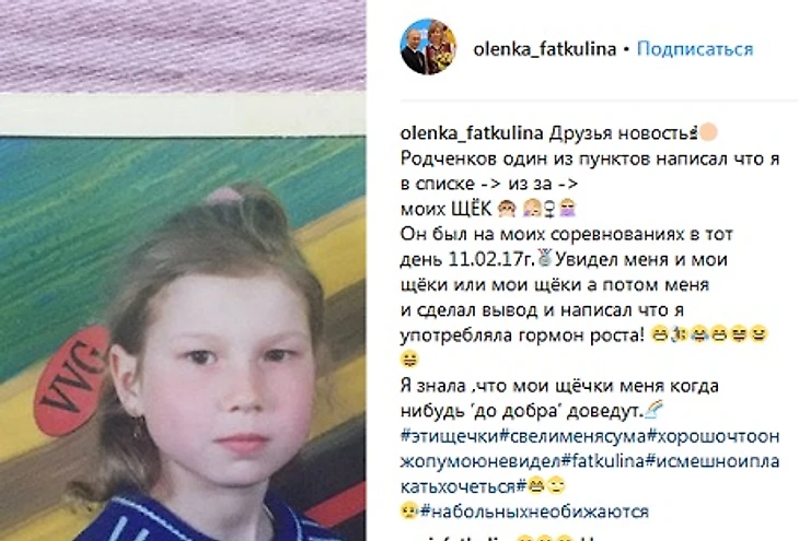 «Друзья, новость! Родченков в одном из пунктов написал, что я в списке из-за моих щек!Он был на моих соревнованиях в тот день 11.02.2014 (день, когда Фаткулина выиграла серебро Сочи-2014 – прим. Sports.ru). Увидел меня и мои щеки или мои щеки, а потом меня, и сделал вывод и написал, что я употребляла гормон роста! Я знала, что мои щечки меня когда-нибудь до добра доведут. Эти щечки свели меня с ума. Хорошо, что он жопу мою не видел. И смешно, и плакать хочется, но на больных не обижаются», – написала Фаткулина.