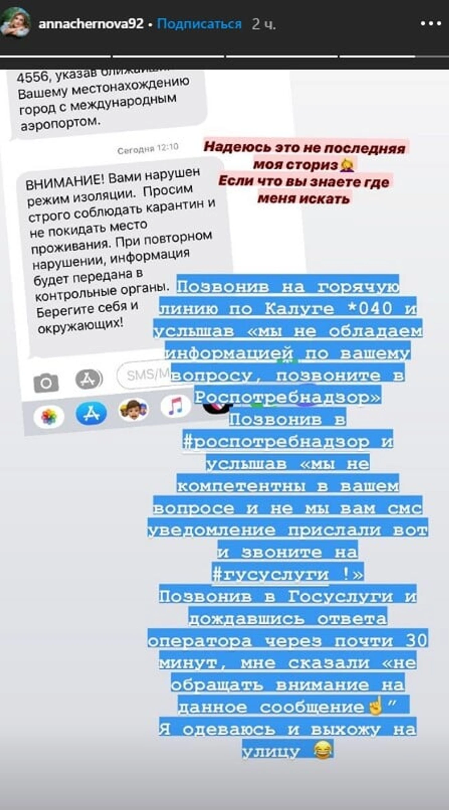 Позвонив в «Госуслуги» и дождавшись ответа оператора через почти 30 минут, мне сказали не обращать внимания на данное сообщение. Я одеваюсь и выхожу на улицу», – написала Чернова.