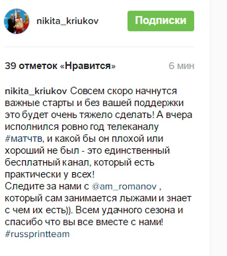 «Совсем скоро начнутся важные старты, и без вашей поддержки это будет очень тяжело сделать. А вчера исполнился ровно год телеканалу «Матч ТВ», и какой бы он плохой или хороший ни был – это единственный бесплатный канал, который есть практически у всех», – написал Крюков.