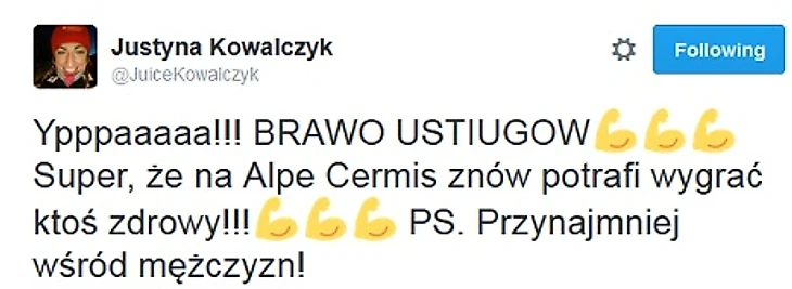 «Ура! Браво, Устюгов! Супер, что на Альпе Чермис снова победил кто-то здоровый! Во всяком случае, среди мужчин», – написала Ковальчик.