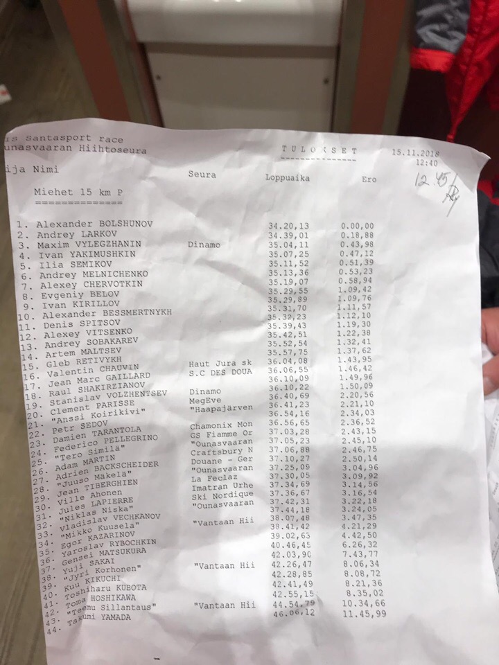 1. Александр Большунов – 34.20,132. Андрей Ларьков – 18,883. Максим Вылегжанин – 43,984. Иван Якимушкин – 47,125. Илья Семиков – 51,396. Андрей Мельниченко – 53,237. Алексей Червоткин – 58,948. Евгений Белов – 1.09,4210. Александр Бессмертных – 1.11,5711. Денис Спицов – 1.12,1012. Алексей Виценко – 1.19,3013. Артем Собакарев – 1.22,3814. Артем Мальцев – 1.32,4115. Глеб Ретивых – 1.37,62...17. Жан Марк Гайар (Франция) – 1.46,4218. Рауль Шакирзянов – 1.49,9619. Станислав Волженцев – 1.50,09...24. Федерико Пеллегрино (Италия) – 2.43,15...33. Владислав Вечканов – 3.24,05