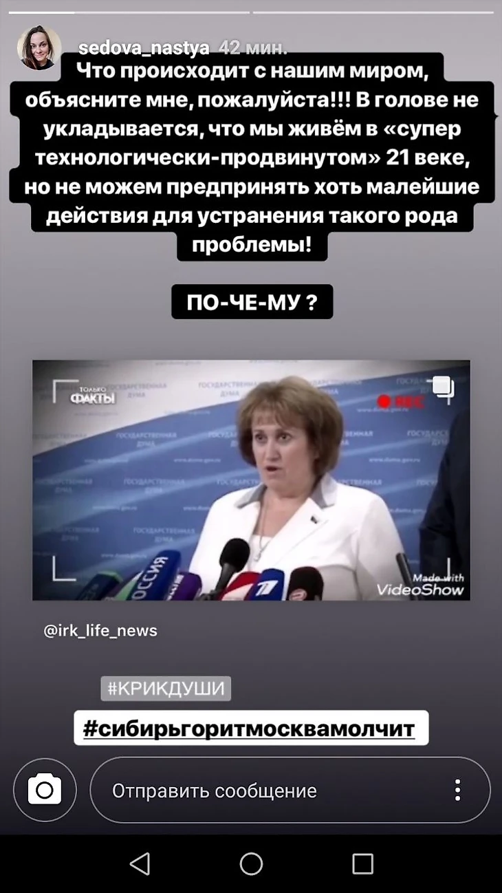 Я не знаю, поможет это каким-то образом или нет, но хочется цепляться за каждый возможный шаг и призыв к действиям!» – написала в инстаграме Седова, прикрепив ссылку на петицию и поставив хэштег #СибирьгоритМосквамолчит.