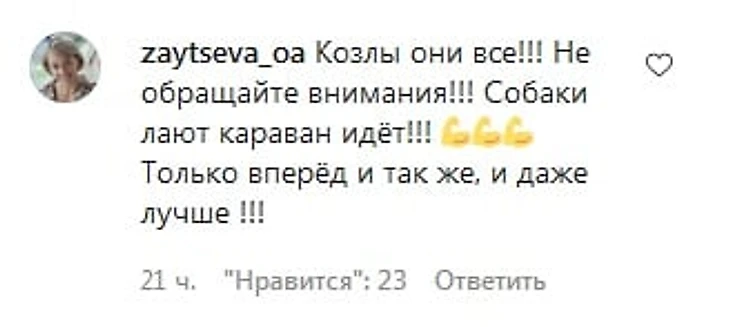 «Козлы они все! Не обращайте внимания! Собаки лают, караван идет! Только вперед и так же, и даже лучше», – написала Зайцева.