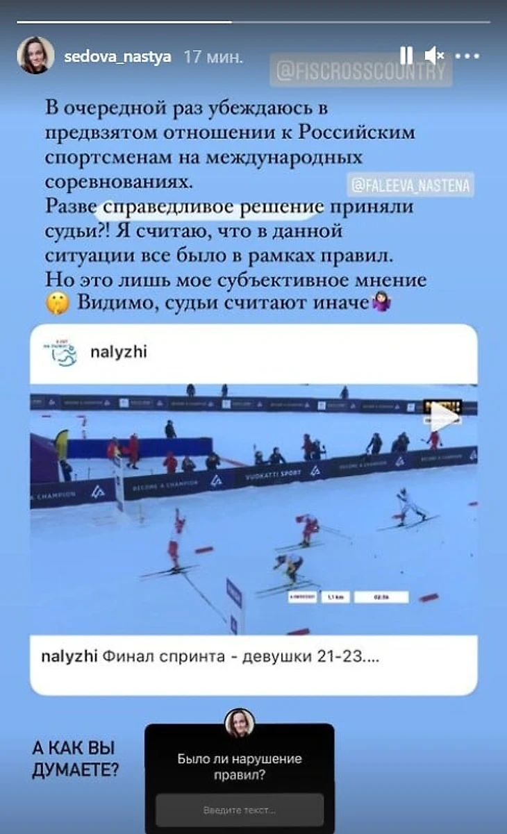 Российская лыжница Анастасия Кулешова отреагировала на инцидент в женском классическом спринте на чемпионате мира среди молодежи.