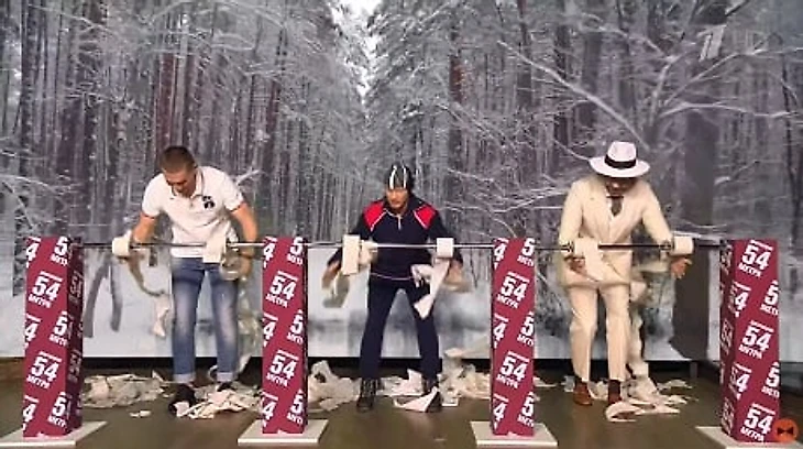 В конце передачи Ургант, Большунов и Дмитрий Хрусталев сыграли в игру по отматыванию туалетной бумаги. Победу одержал Большунов.