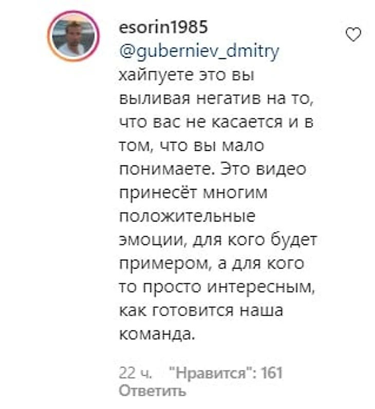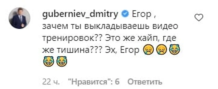 «Егор, зачем ты выкладываешь видео тренировок? Это же хайп, где же тишина? Эх, Егор», – написал Губерниев комментарий под этим видео.