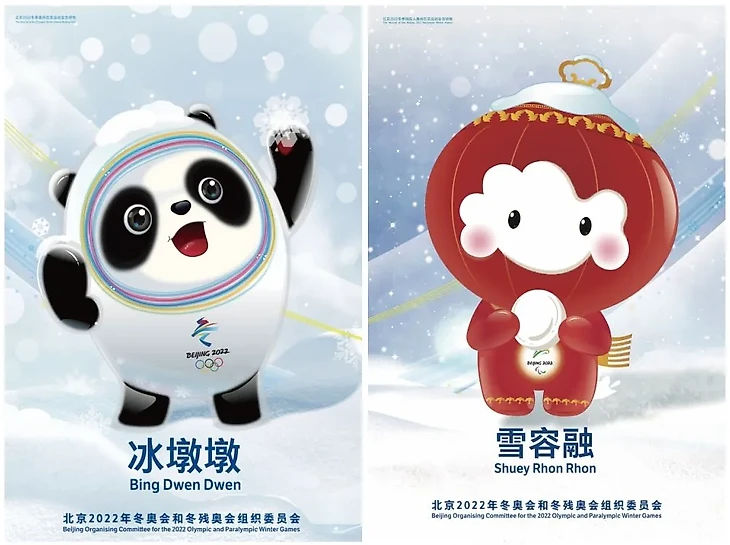 На афишах изображены талисманы Олимпийских и Паралимпийских игр – панда Бин Двэнь Двэнь и фонарик Шуэй Рон Рон.