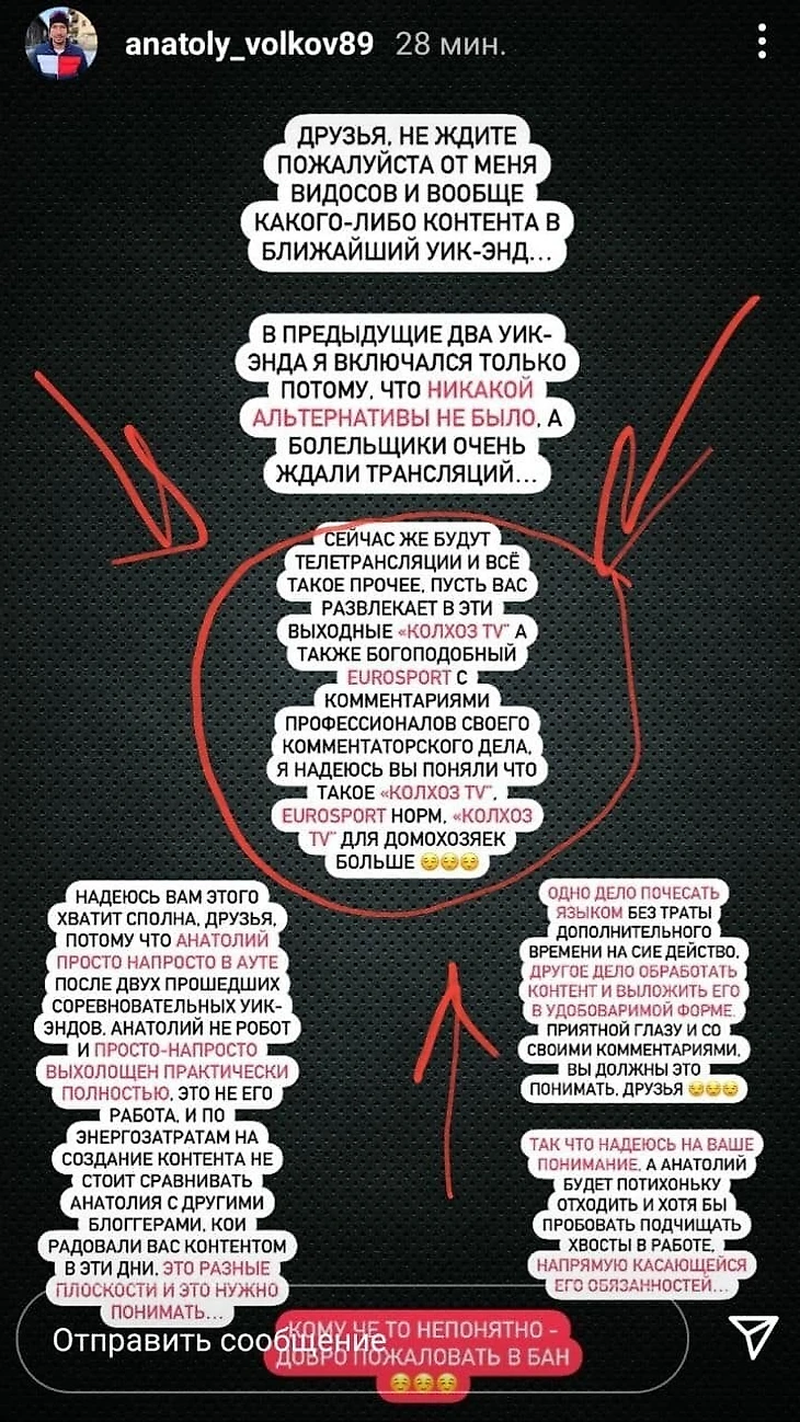 «Друзья, не ждите, пожалуйста, от меня видосов и вообще какого-либо контента в ближайший уик-энд... В предыдущие два уик-энда я включался только потому, что никакой альтернативы не было, а болельщики очень ждали трансляций...