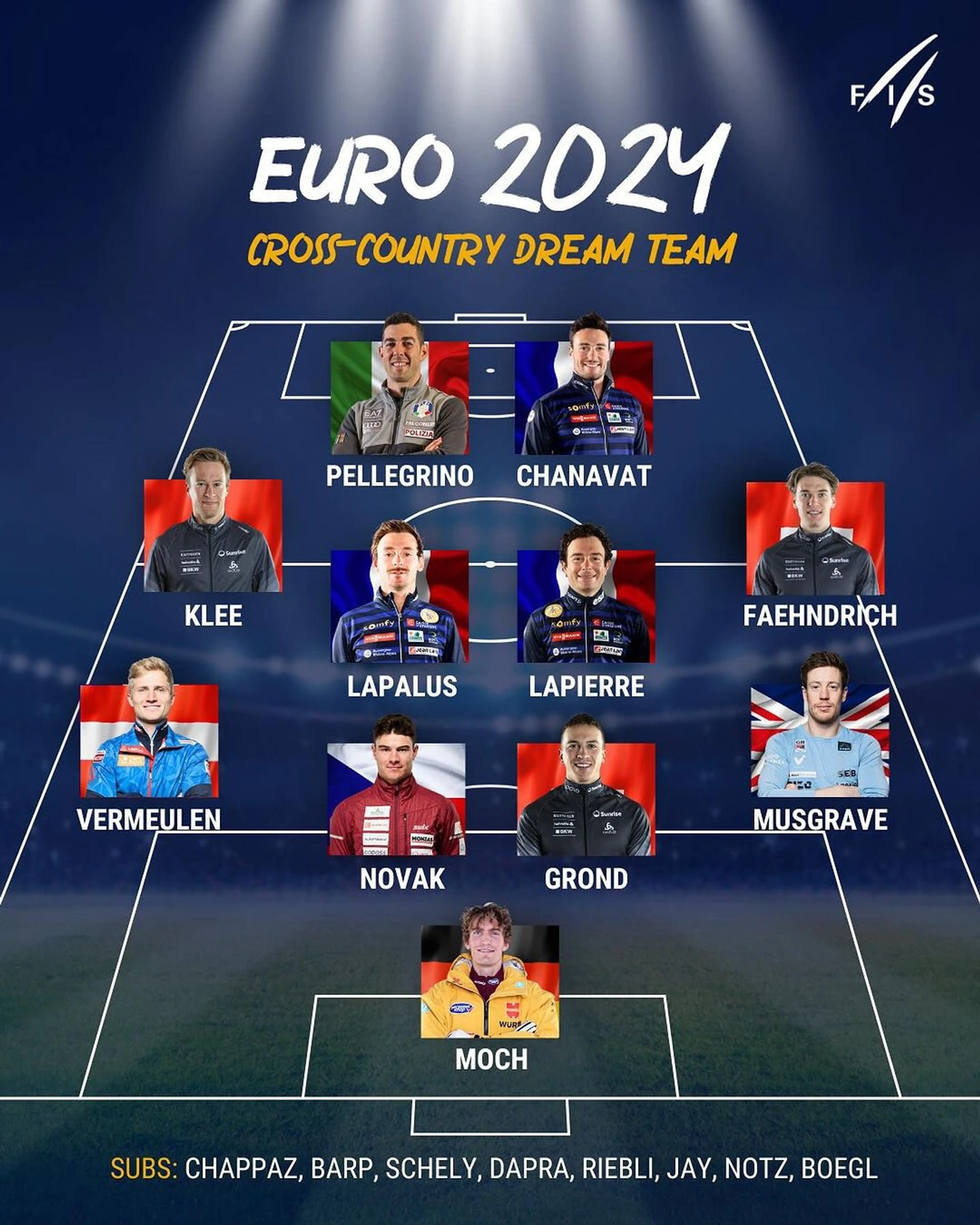 Международная федерация лыжного спорта (FIS) опубликовала в соцсетях символическую сборную лыжников из стран-участник футбольного Евро-2024.