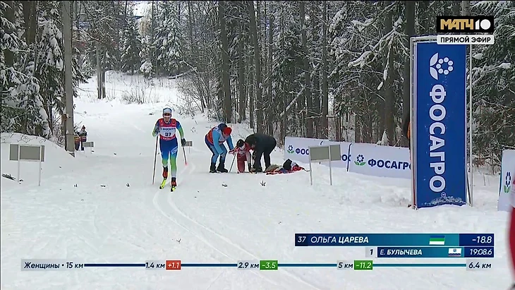 На дистанции у нее «простреливали» лыжи, это привело к неудачному движению и повреждению. Комментаторы Всеволод Соловьев и Александр Легков сообщили, что у Степановой проблемы с ногой.