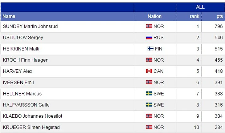 296 очков набрал Сергей Устюгов за прошедшие 6 этапов гонки. С 546 очками российский лыжник занимает 2 место в общем зачёте кубка мира.