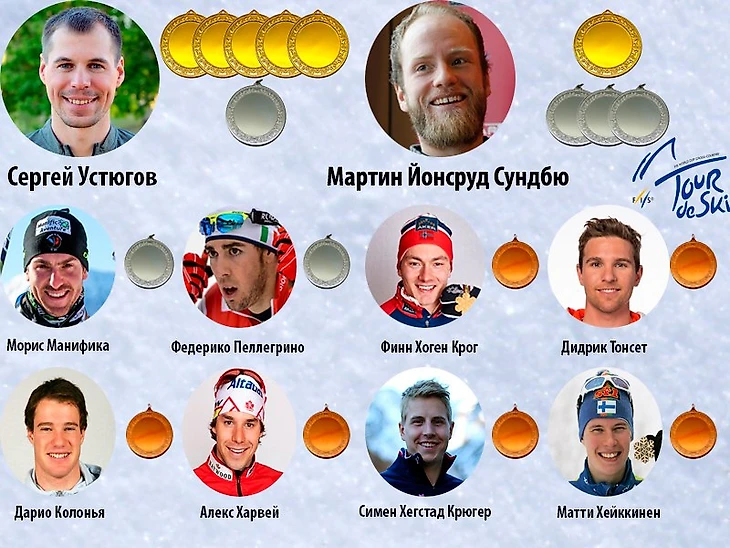 Самая крупная победа Тур де Ски принадлежит Мартину Йонсруду Сундбю, который в финале прошлогодней многодневки на 3 минуты 15 секунд опередил Финна Хагена Крога, пришедшего к финишу вторым.